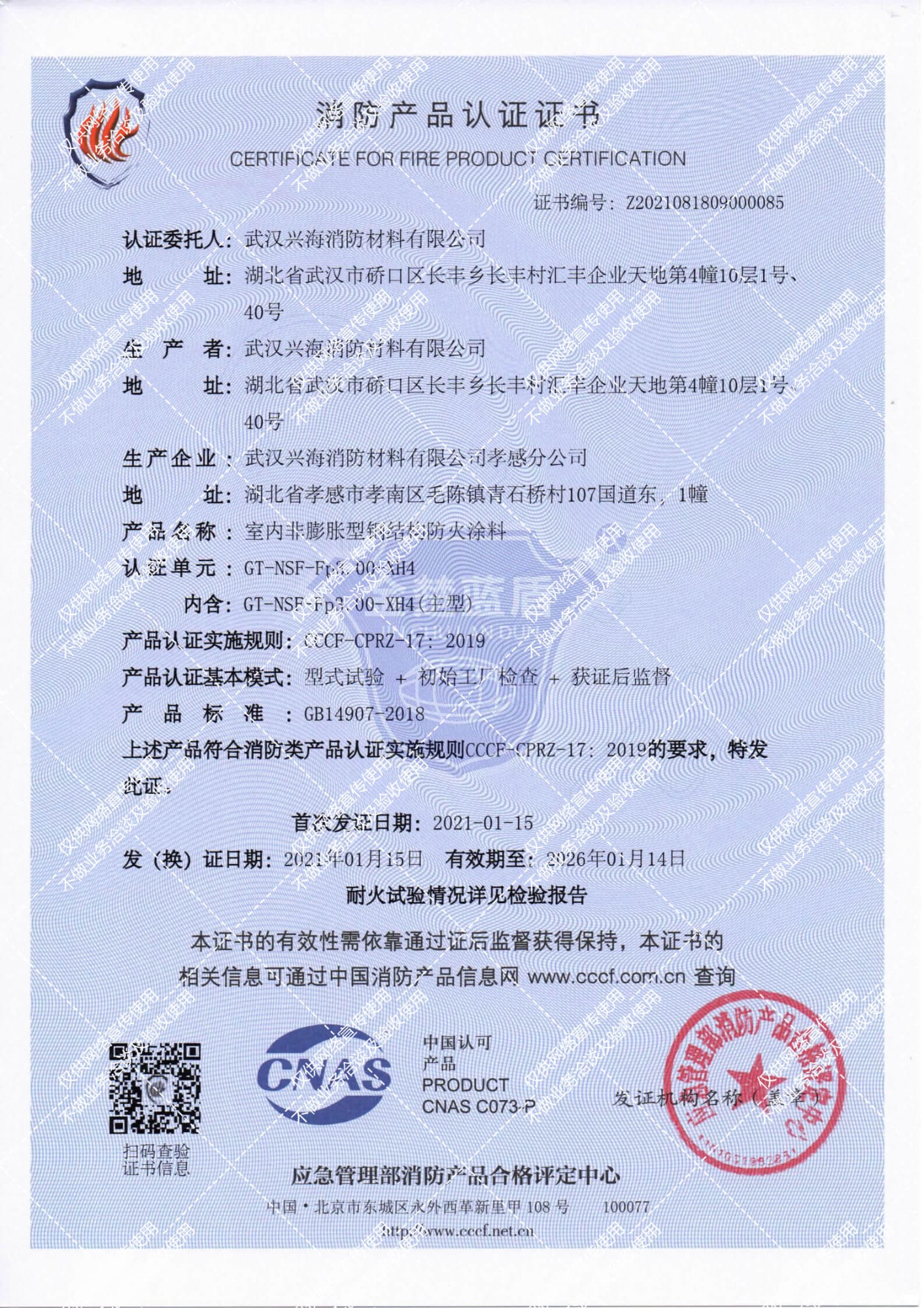 : 室內(nèi)非膨脹型2小時防火涂料證書