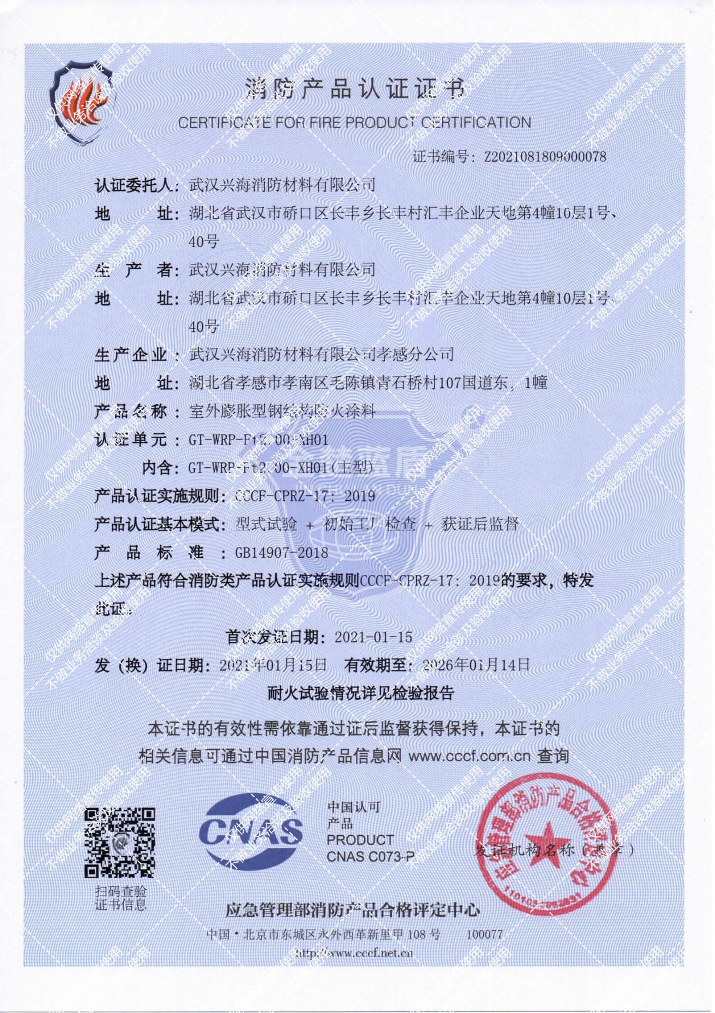 室外膨脹型(特種)鋼結(jié)構(gòu)防火涂料消防產(chǎn)品認(rèn)證證書